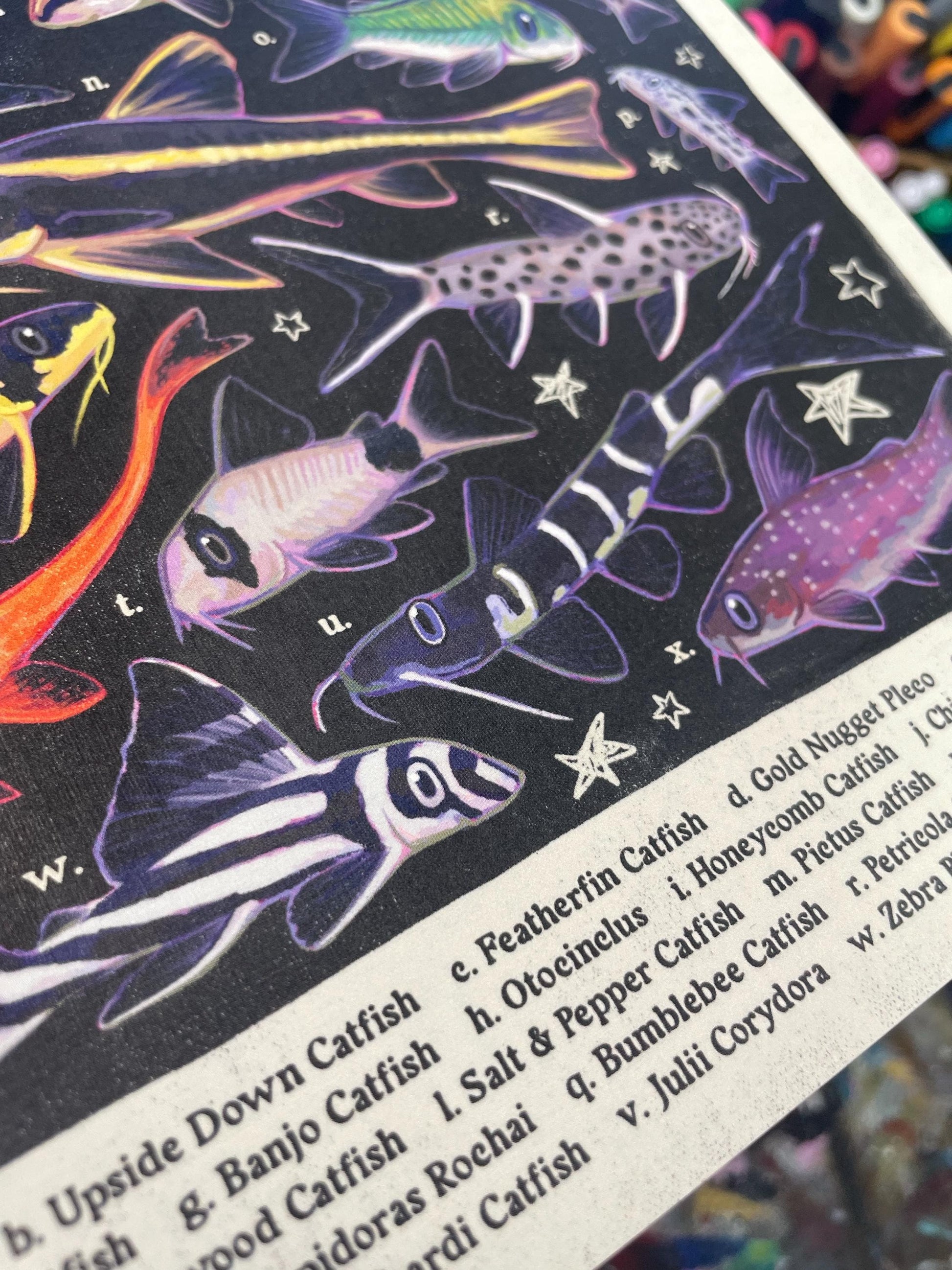 🐠 Some freshwater aquarium catfish! A hand-drawn poster with a linen-textured finish, featuring a few favourite little cats- great decor addition to a fish lover’s wall!